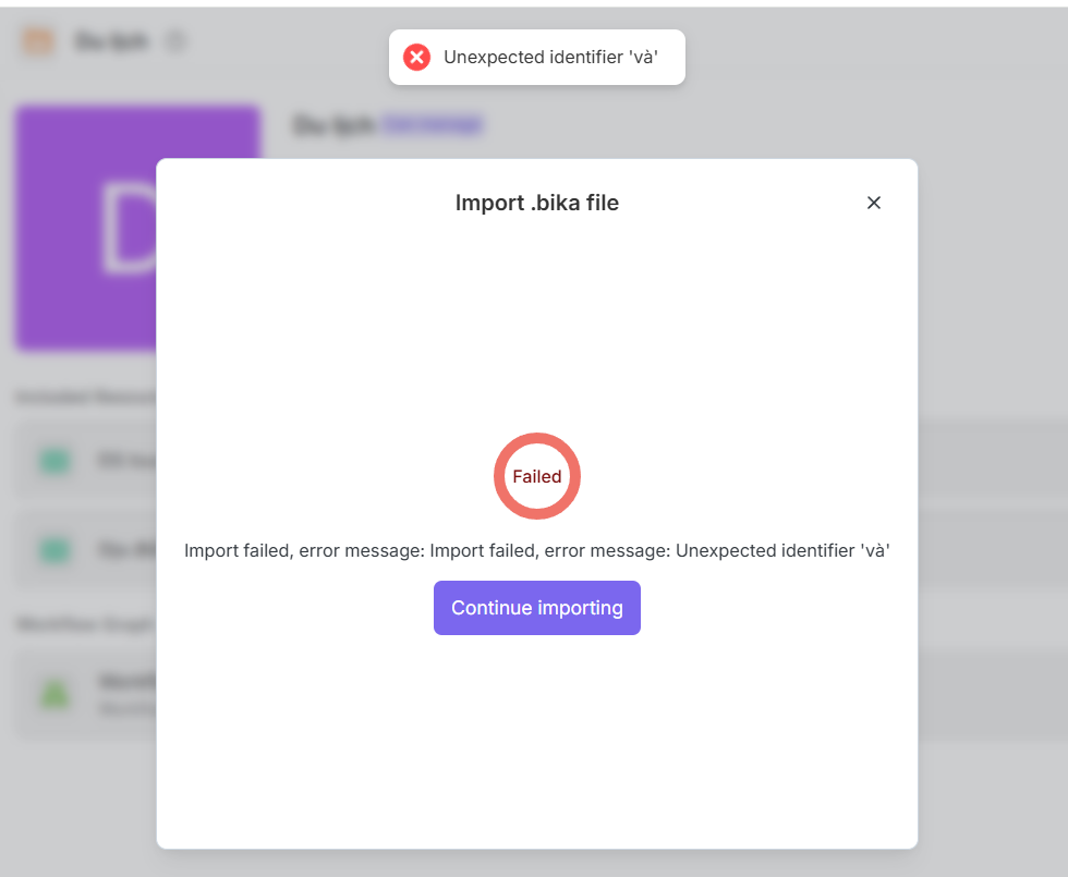 “Import failed, error message: Import failed, error message: Unexpected identifier ‘và’”