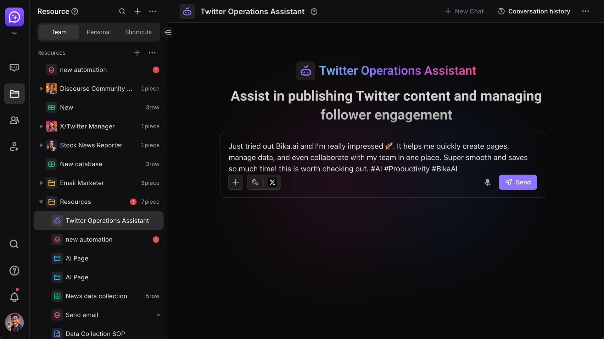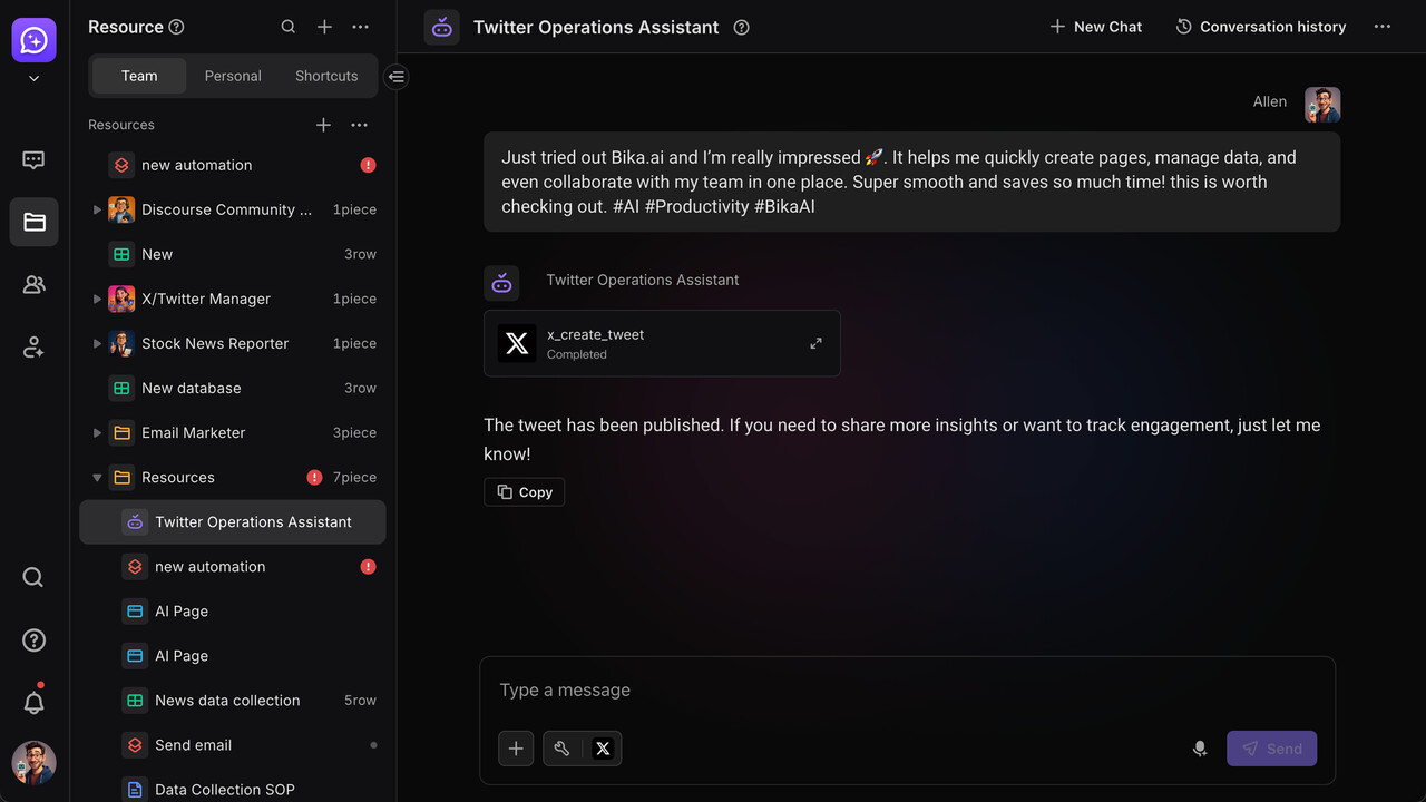 An AI Agent is a customizable intelligent assistant you can build on the Bika platform to handle specific tasks. We’ll use “building a Twitter (X) Operations Assistant” as an example to show you how to configure a custom AI Agent from scratch—solving daily needs like Twitter content publishing and fan engagement.