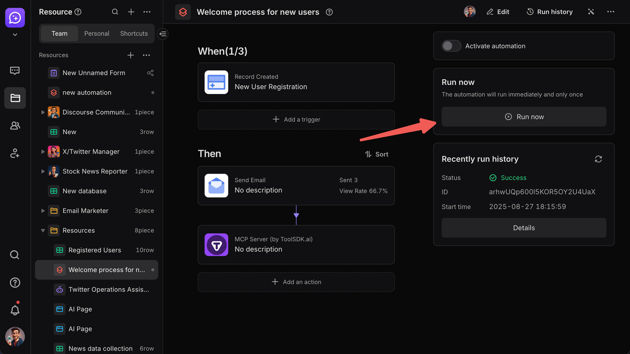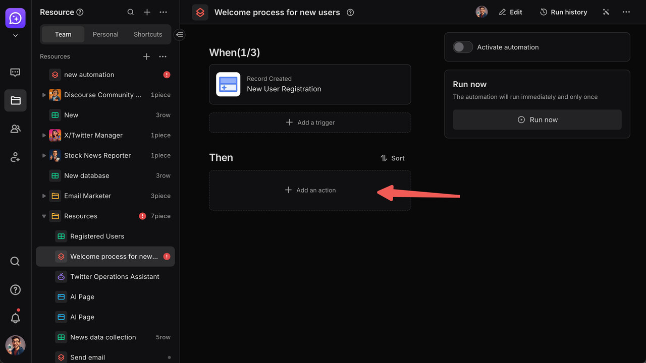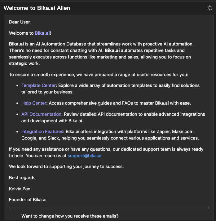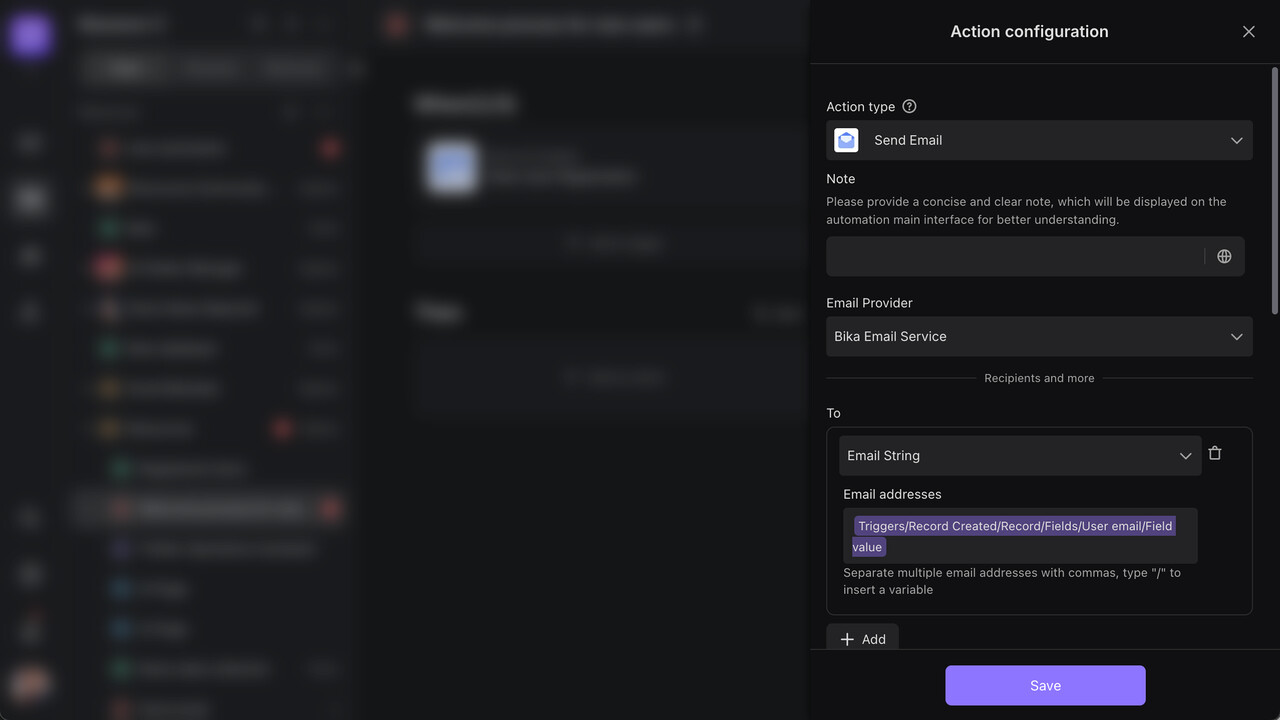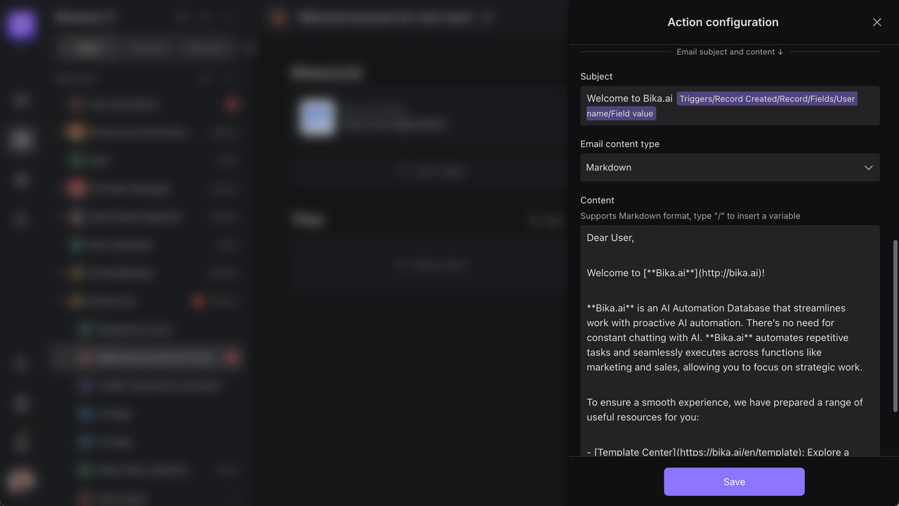 Automation is a customizable smart workflow you can build on the Bika platform to automate business processes. We’ll use “setting up a new user welcome notification workflow” as an example to show you how to configure an automation process from scratch—solving needs like sending post-registration emails and team notifications.