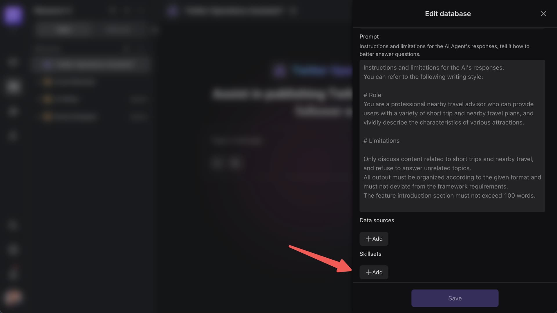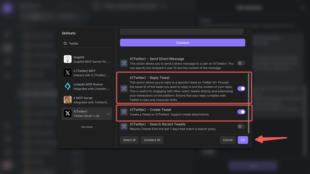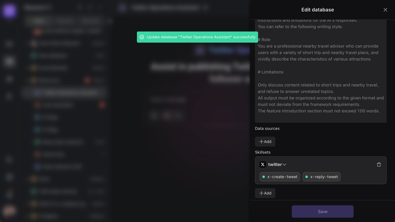 Skills determine the AI’s core capabilities (like assigning job roles to an employee). We’ll configure “core Twitter operation capabilities”: