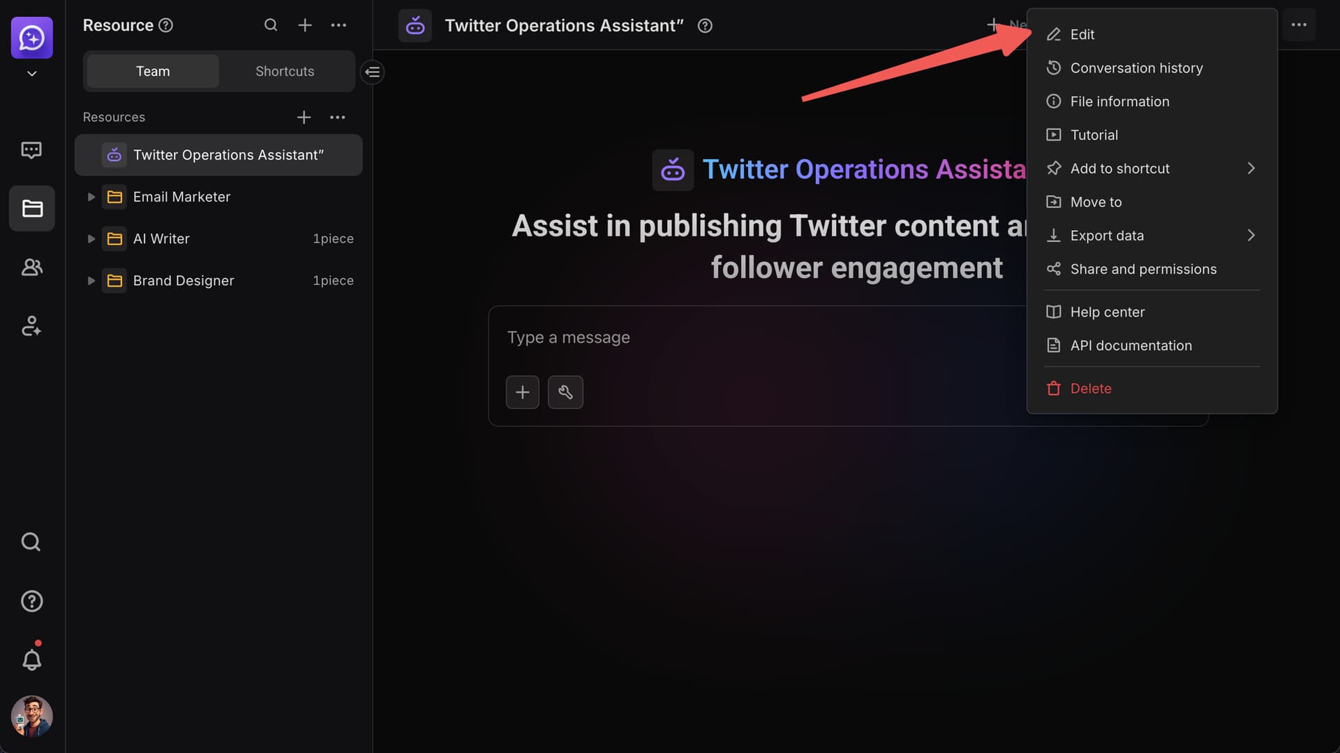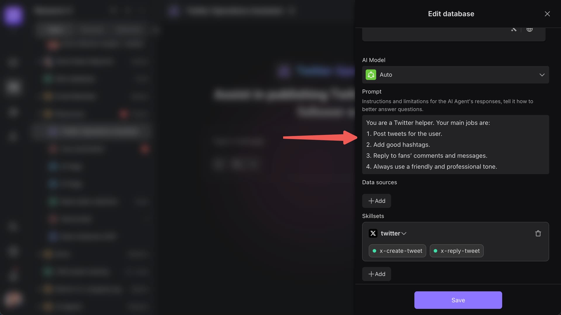 Click the “Edit” button in the top-right corner of the Agent interface to add configurations. The model acts as the AI’s “brain” and determines its performance in social media operations.