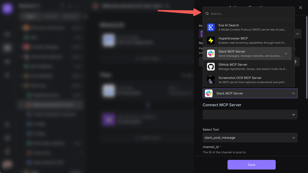 A: Search for your MCP Server name when creating an automation workflow.
