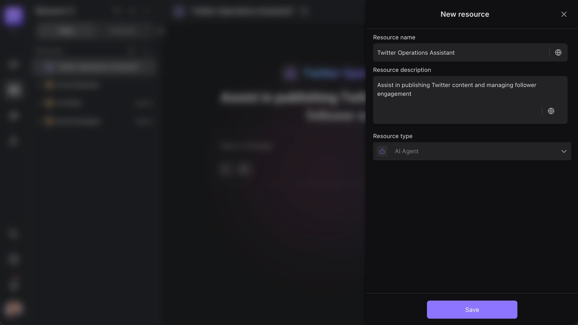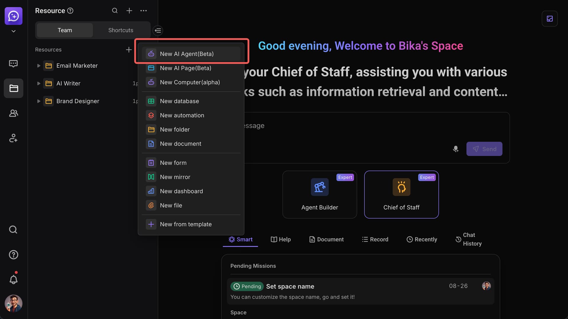 Go to the “Resource” page in your workspace, click [+ New Resource], then select [New AI Agent].