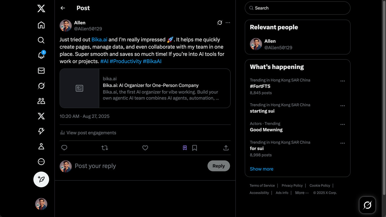 . It helps me create pages quickly, manage data, and even collaborate with my team in one place. Super smooth and time-saving! Worth checking out. ai #Productivity #BikaAI”