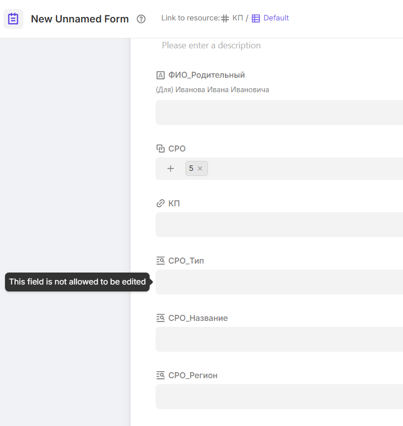 However there are two major downsides: 1) It won’t allow editing the fields in the row because that’s a hard link. 2) It won’t show the values in the Form. So after selecting the CPO it looks like this:
