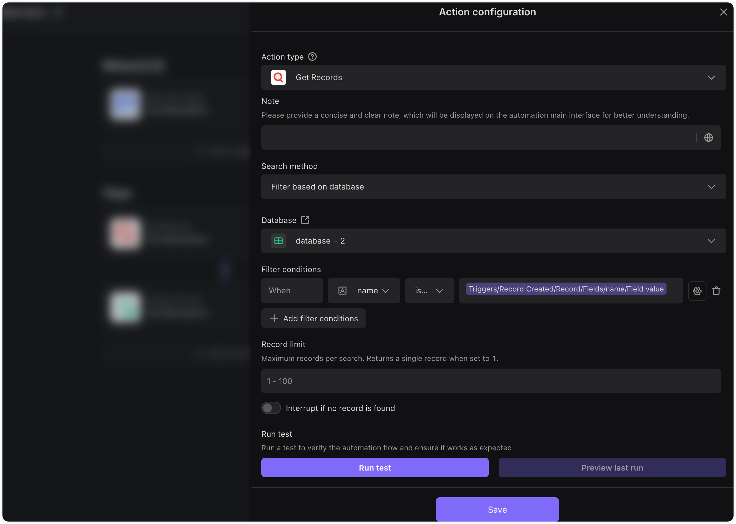 If you need to use data from the secondary database (or multiple databases), add a Get Records action in your automation to retrieve the related records from that database.
