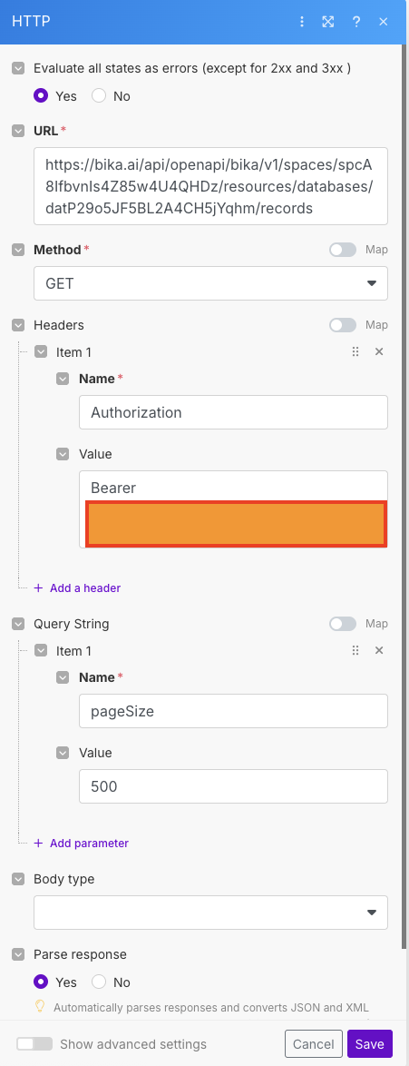 I am trying to retrieve records using the API: https://bika.ai/api/openapi/bika/v2/spaces/:spaceId/resources/databases/:databaseId/records.