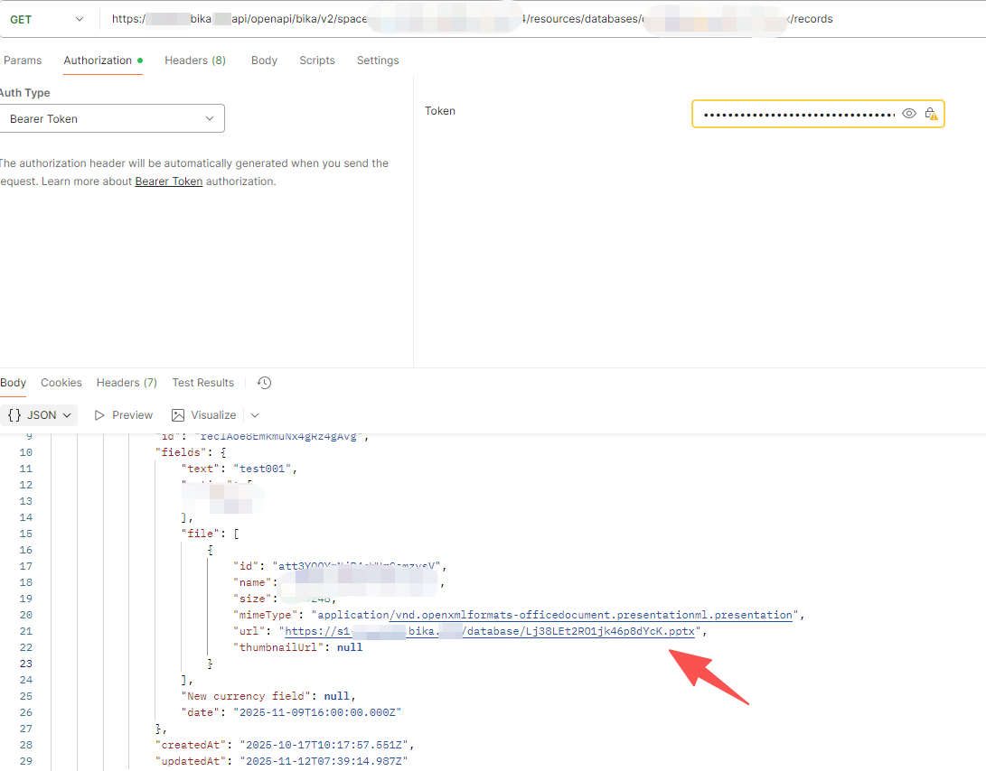 Bika does not display file URLs directly inside the interface. If you need to get the file URL stored in a record, you can retrieve it through the API using the steps below.
