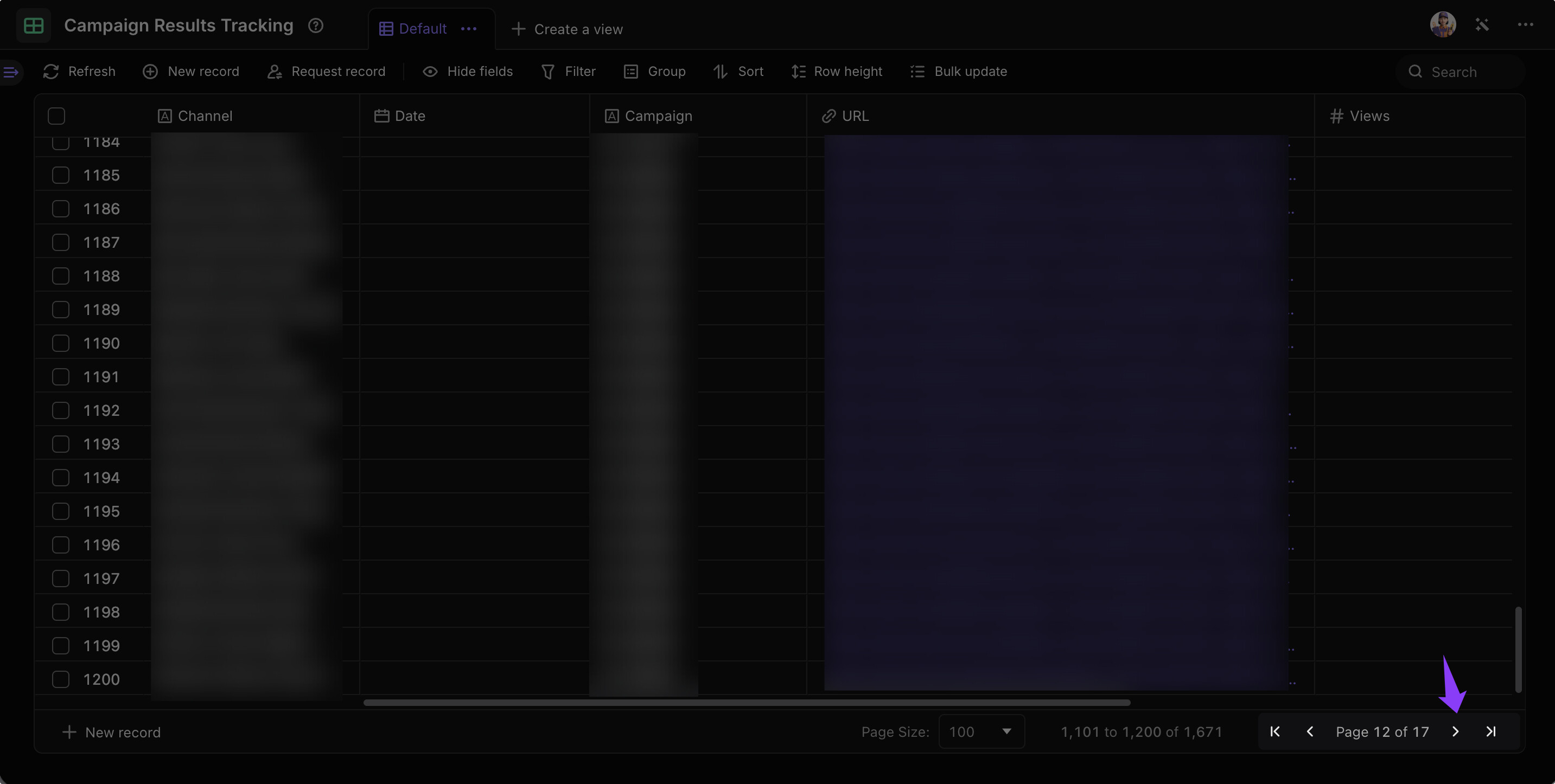 Just checking — have you tried using the > and >| buttons to switch pages? I tested with 1,000 rows and didn’t need to scroll down to move to the next page, though behavior might vary by browser or dataset size.