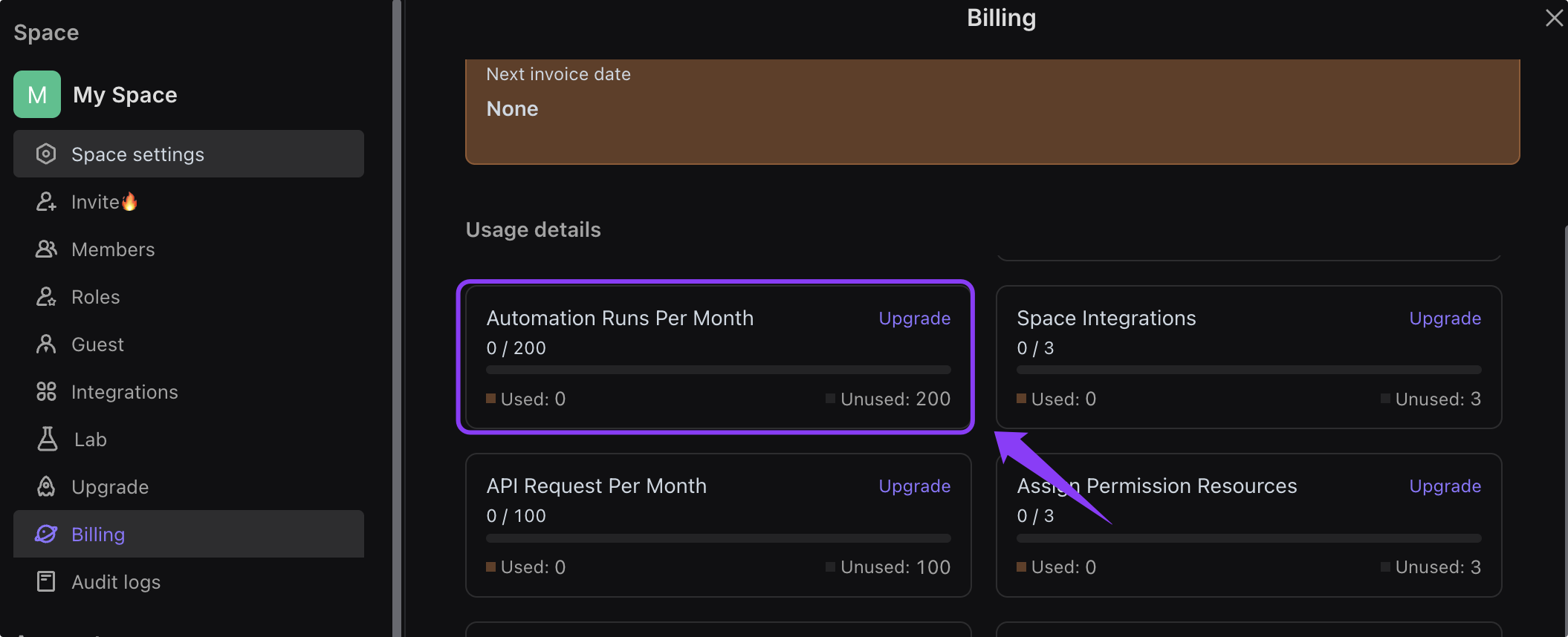 And to review your automation activity, go to Billing → Automation Runs Per Month.