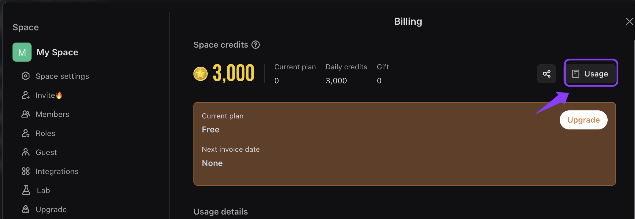 You can check what consumed your credits under Space Settings → Billing → Usage.