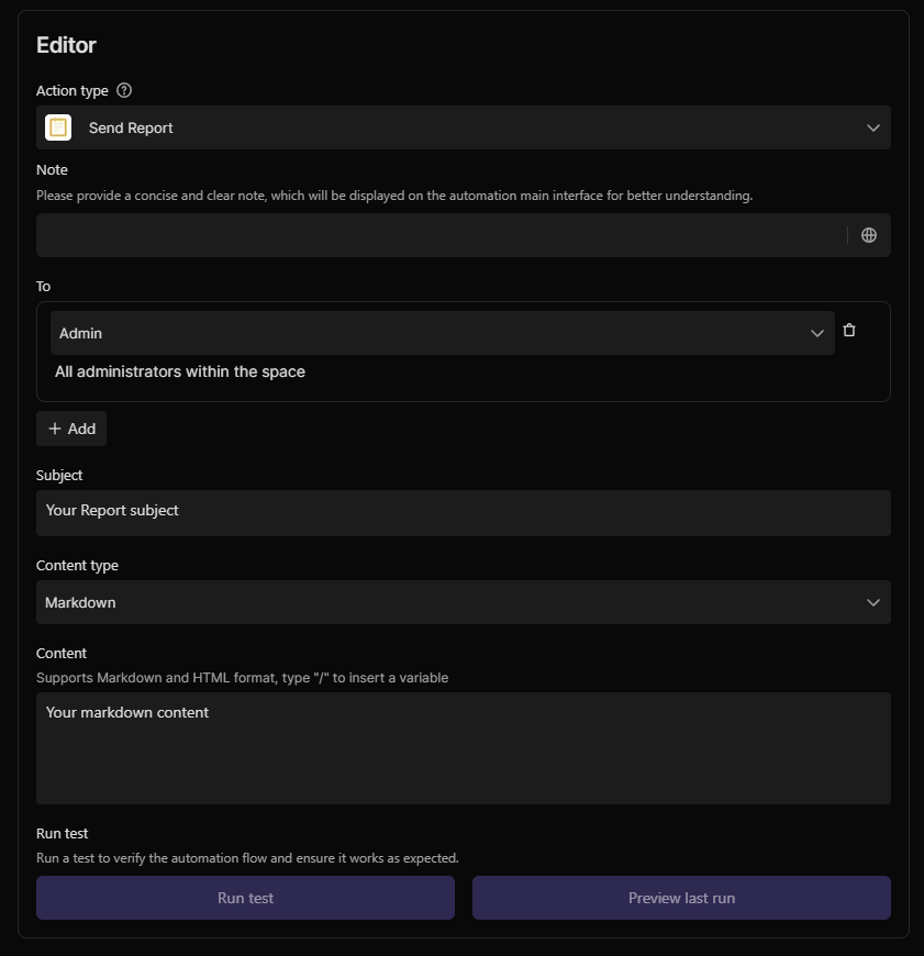 The “Send Report” action is mainly used within Automations — it’s designed to share updates or progress reports with specific members or groups.