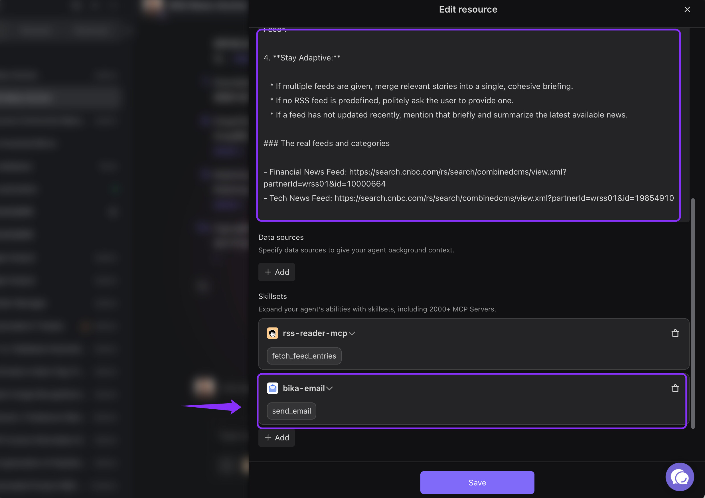 If you just want the report to be sent to your own email, you can simply add a skillset (bika-email) inside your RSS News Anchor agent.